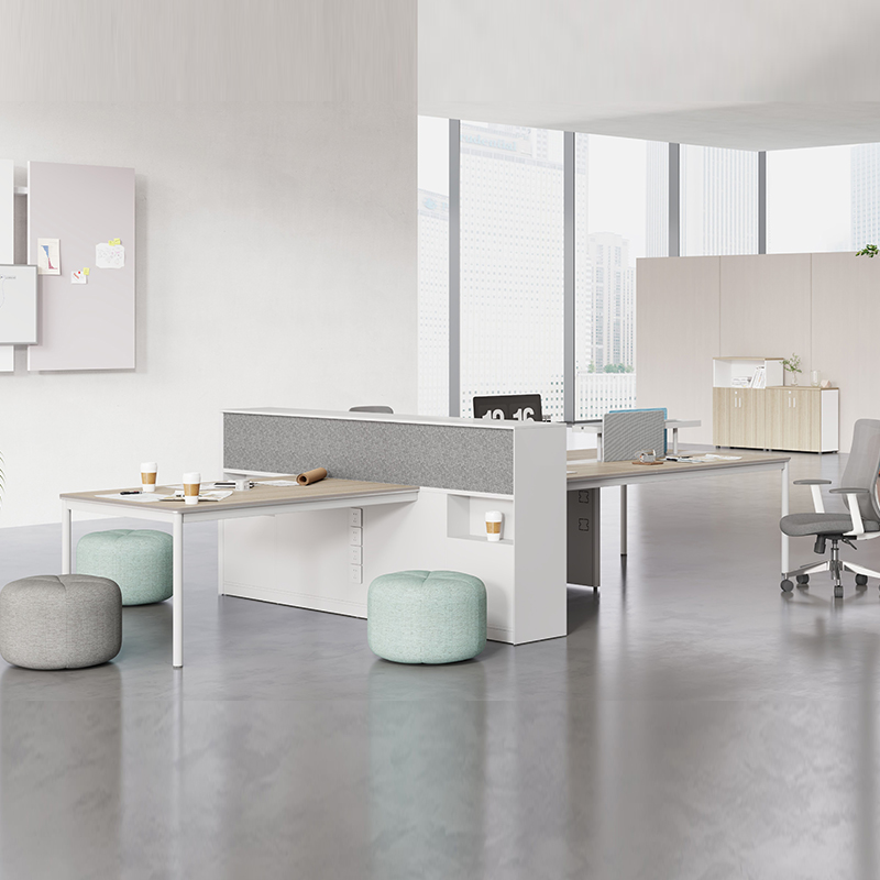 1、基材:符合E0級標準的MFC板材; 2、啞光白五金腳; 3、臺面雙色封邊,子午灰+亮光銀; 4、線盒:工作位配嘉祥寶R92線蓋帶USB,共享位配白色OEUP003G帶USB升降插座; 5、多功能桌上屏配置可移動桌屏板和置物托盤; 6、側柜配置:趟門,機械密碼鎖,86插座裝飾蓋